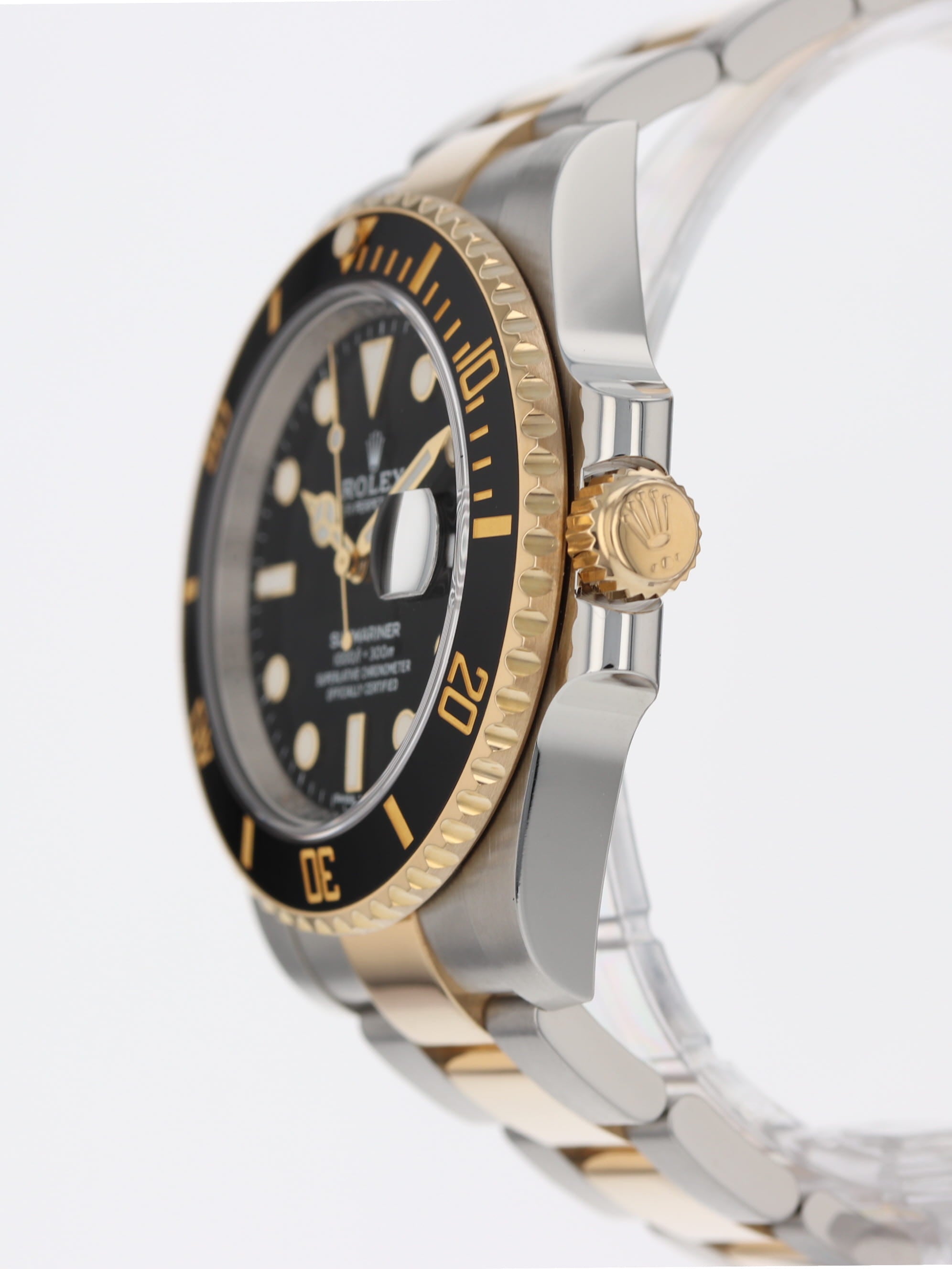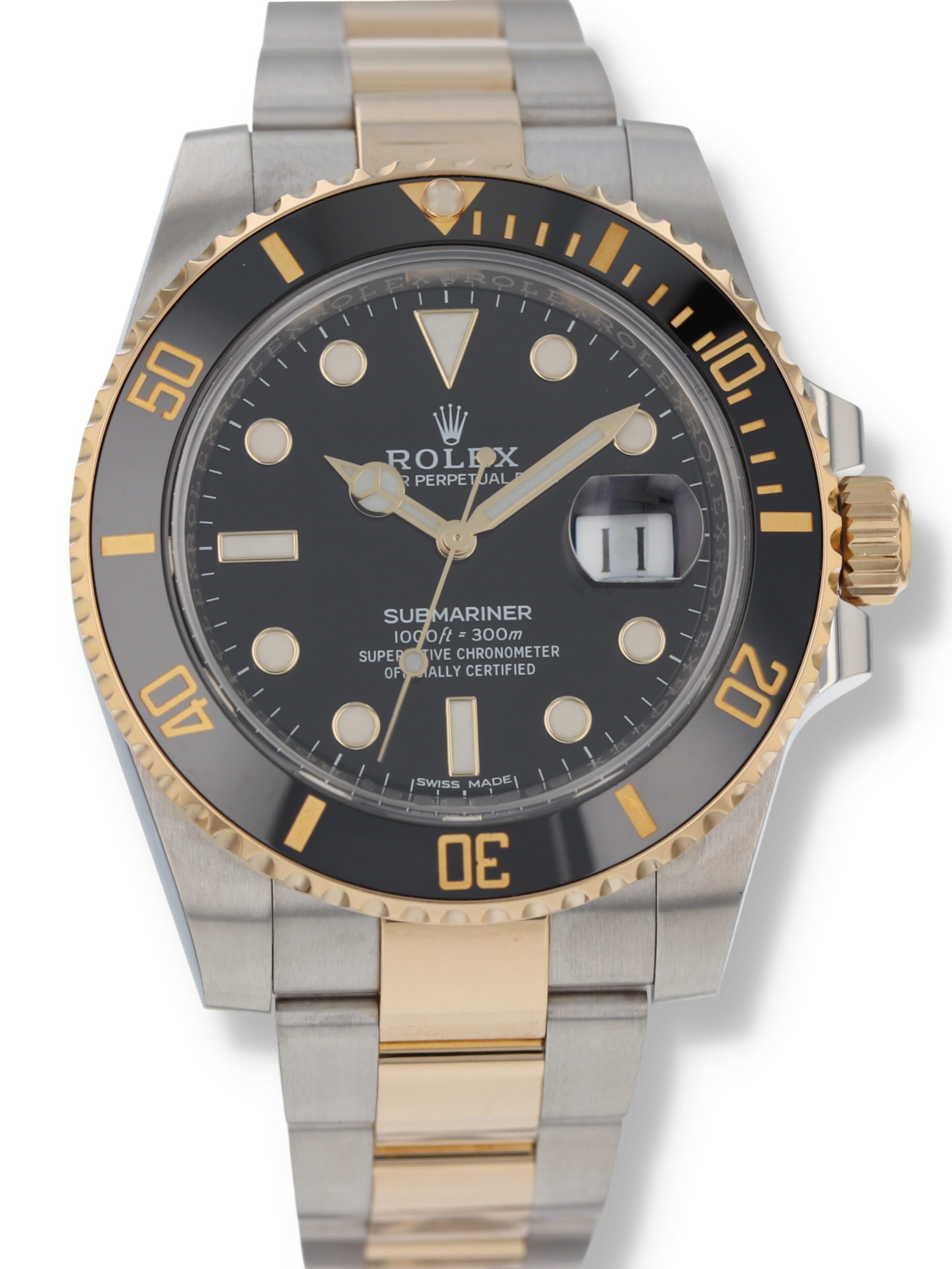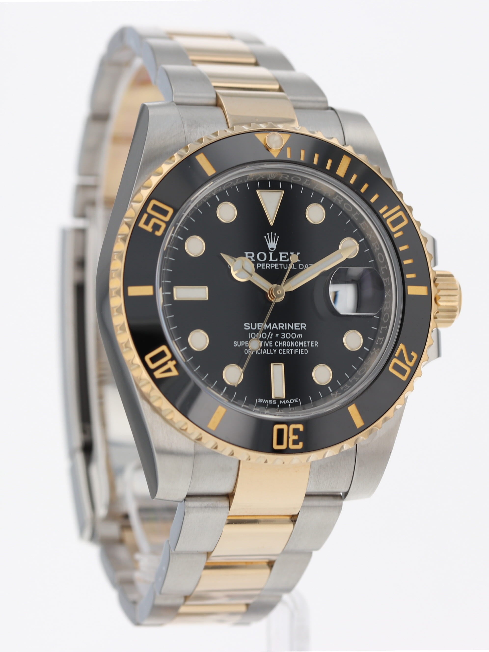 Rolex stainless steel and 18k yellow gold Submariner, automatic, size 40mm. Rolex reference 116613 with a stainless steel case and two tone Oyster bracelet, Folding Oysterlock safety clasp with Rolex Glidelock extension system, 18k uni-directional black Ceramic bezel, black index dial, blue luminescence, magnified date display, sapphire crystal. Rolex box and 2018 card. One year full warranty.