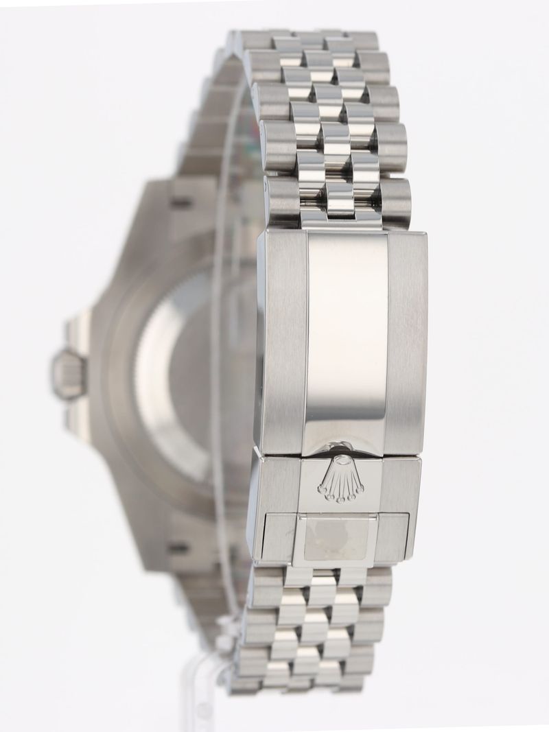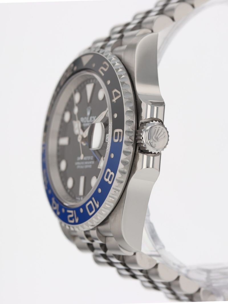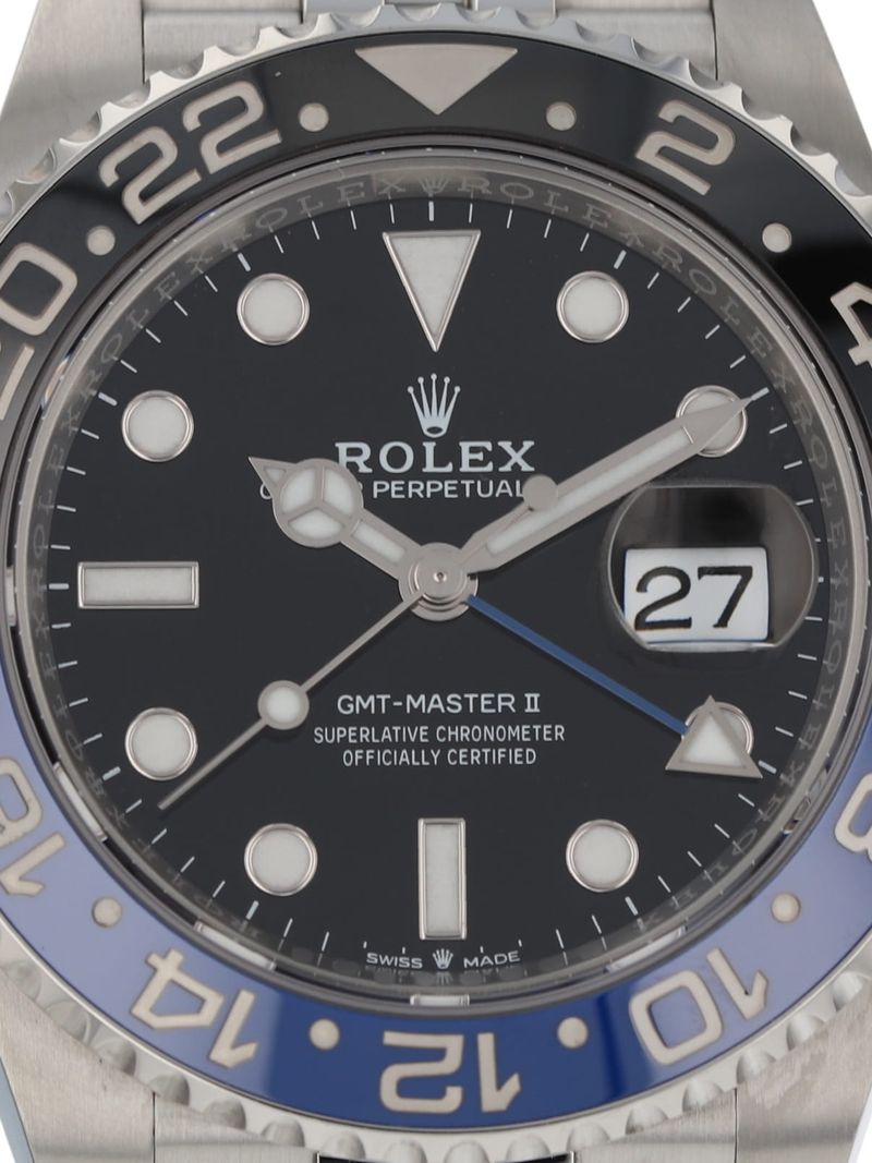 Rolex stainless steel GMT-Master II, automatic, size 40mm. Rolex reference 126710BLNR "Batman Jubilee" or "Batgirl" with a stainless steel case and Jubilee bracelet, bidirectional rotatable 24-hour graduated bezel with black and blue Cerachrom insert and engraved numerals, black dial, Chromalight luminescence, magnified date display, sapphire crystal. 70 hour power reserve. Rolex box and 2023 card.