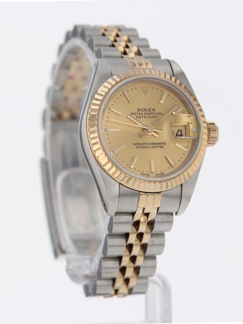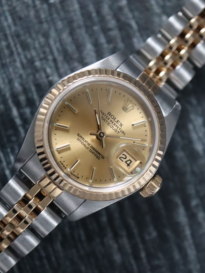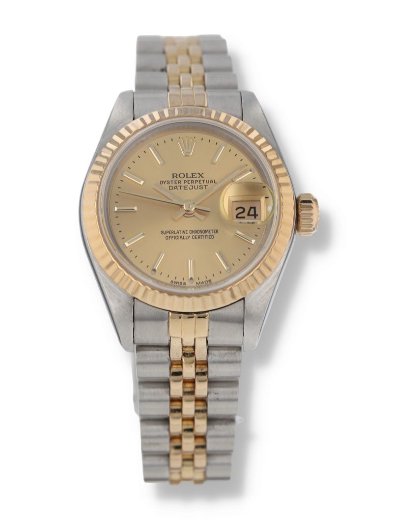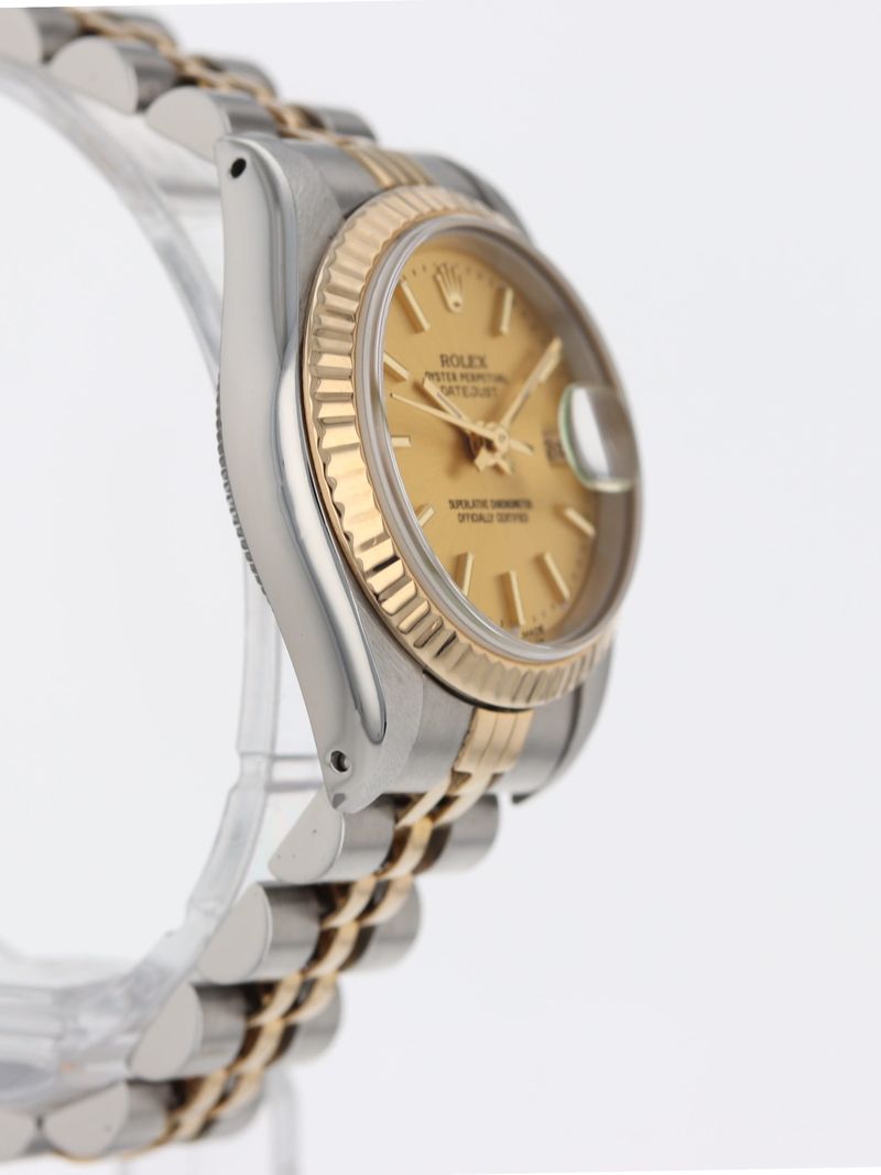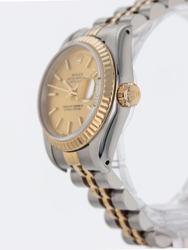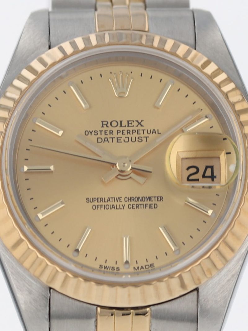 Rolex stainless steel and 18k yellow gold ladies Datejust, automatic, size 26mm. Rolex reference 69173 with a stainless steel case and two tone Jubilee bracelet with steel folding clasp, champagne stick dial, magnified date display, sapphire crystal. Circa 1987. Six months full warranty.
