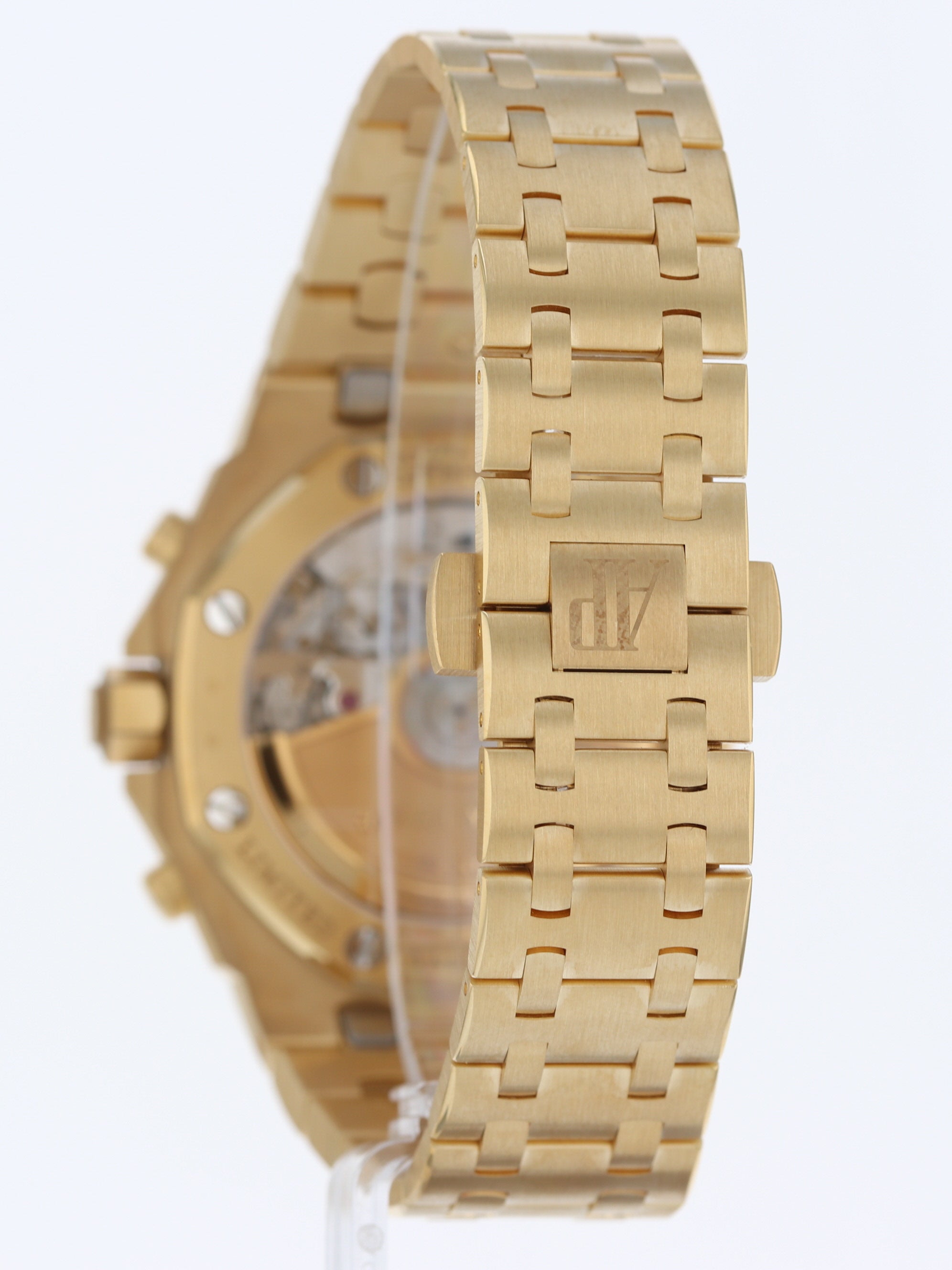 Audemars Piguet Royal Oak Offshore Chronograph, automatic, size 42mm. Audemars reference 26238BA.OO.2000BA.01 with an 18k yellow gold case, exhibition case back, yellow gold dial with vertical satin-finishing, yellow gold Royal Oak hands with luminescence, chronograph. Additional black leather strap with gold tang buckle. Audemars box and card.